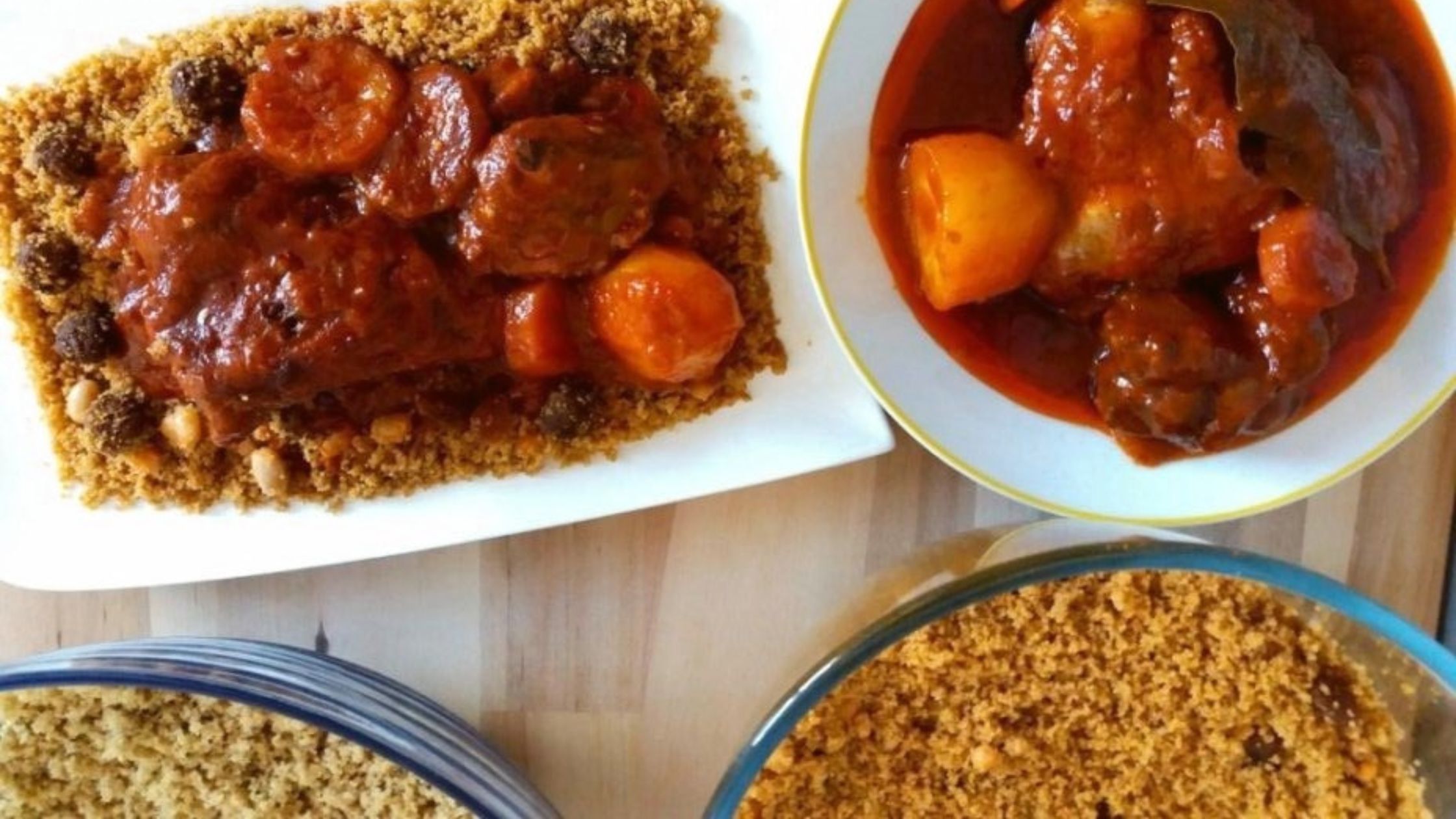 1 poulet, 1 Kg de viande de bœuf, 20cl d’huile, 4 oignons, 1/4 de poivron vert, 300g de tomate concentrée, sel, piment, poivre, 3 bouillons cube, 6 gousses d’ail, 1 kg de thiéré avec du lalo (couscous), 10g de beurre, 50g de raisins secs, 50g de haricots blancs, 100g de viande hâchée, 4 morceaux de sucre, 3 carottes, 3 patates douce, 2 feuilles de laurier.